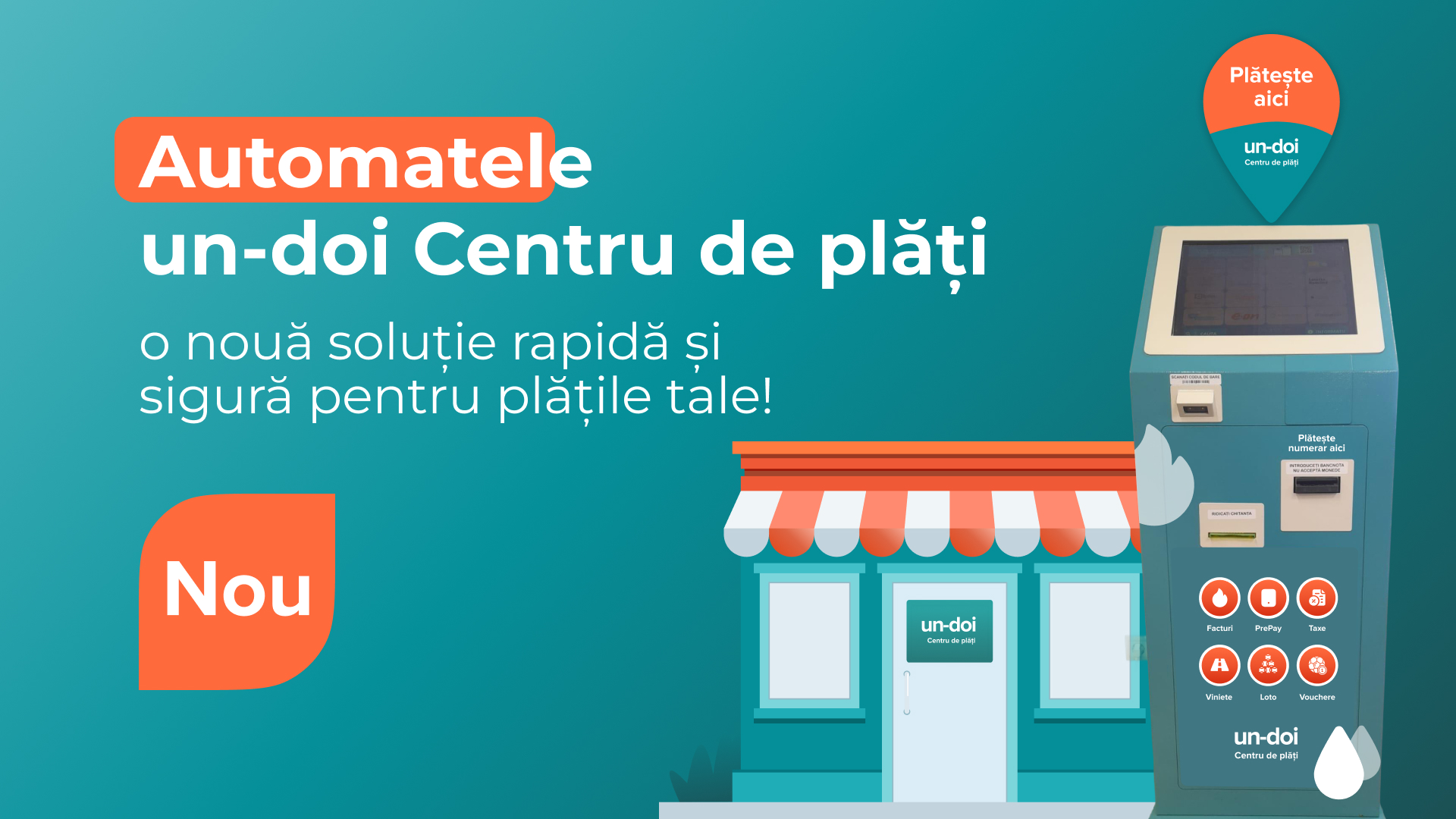 Suntem încântați să anunțăm introducerea unei noi soluții de plată în rețeaua noastră: automatele un-doi Centru de plăți! Acestea îți permit să efectuezi rapid și în siguranță diverse plăți, aproape de casă, fără să pierzi timp la cozi.