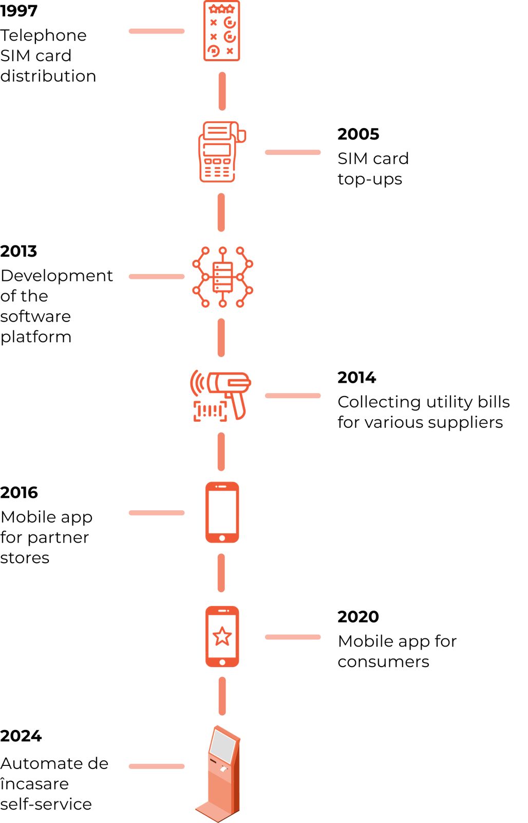 Am început în 1997 în Cluj-Napoca, odată cu lansarea serviciului de telefonie mobilă, cu o echipă specializată în distribuția de cartele telefonice.