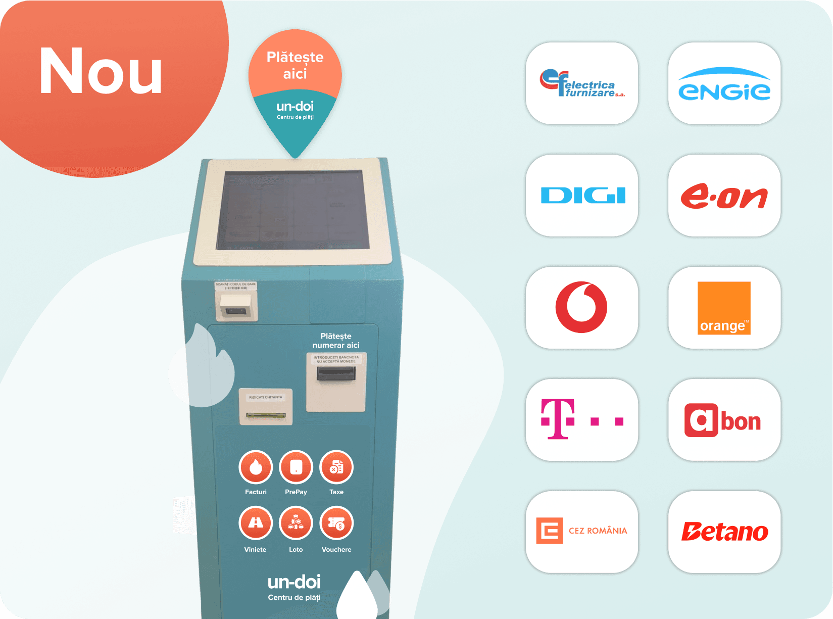 Nu investești niciun ban. Aparatura potrivită pentru încasarea produselor din magazin, a facturilor sau a reîncărcărilor PrePay este 100% asigurată de un-doi Centru de plăți.