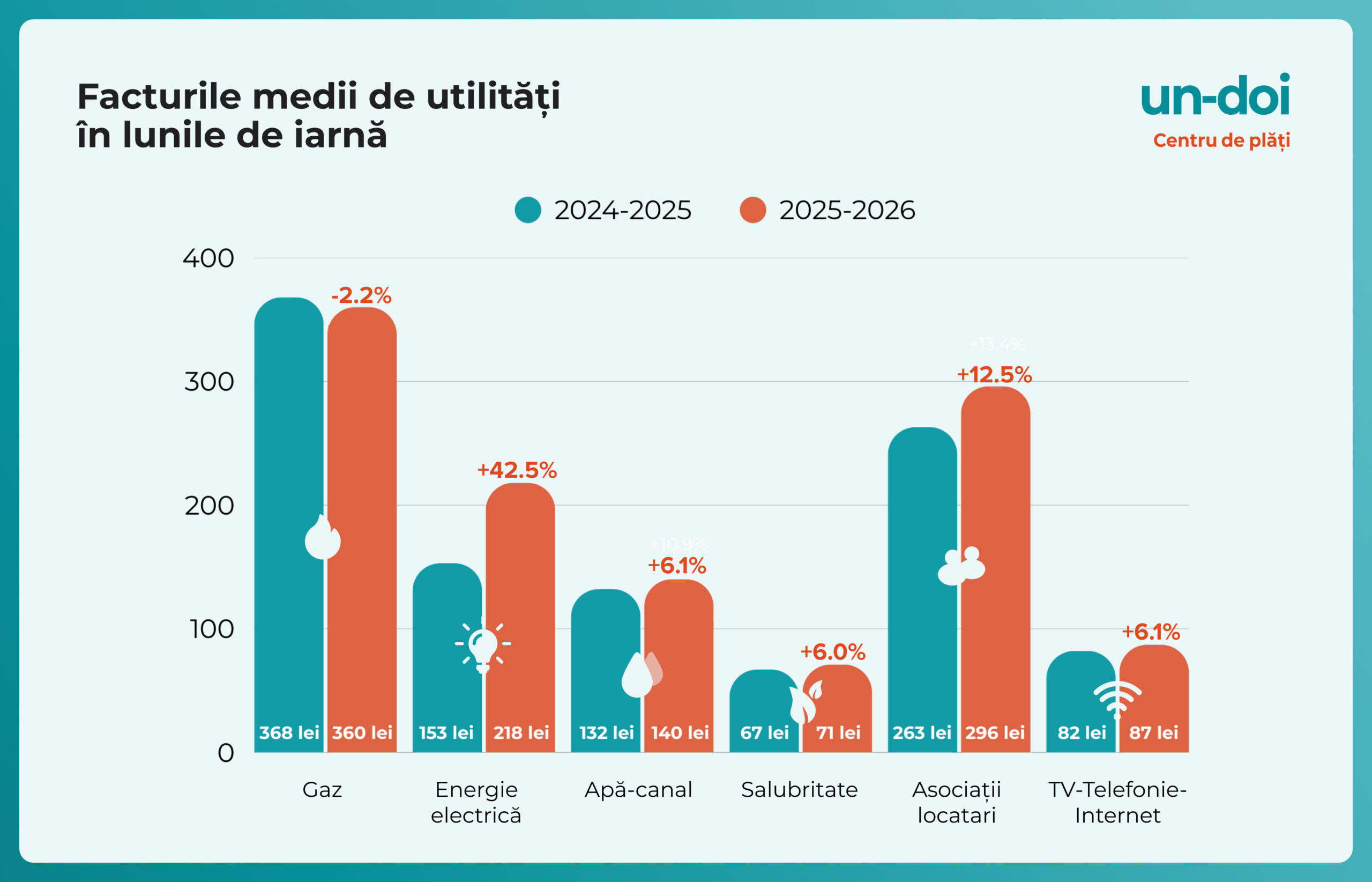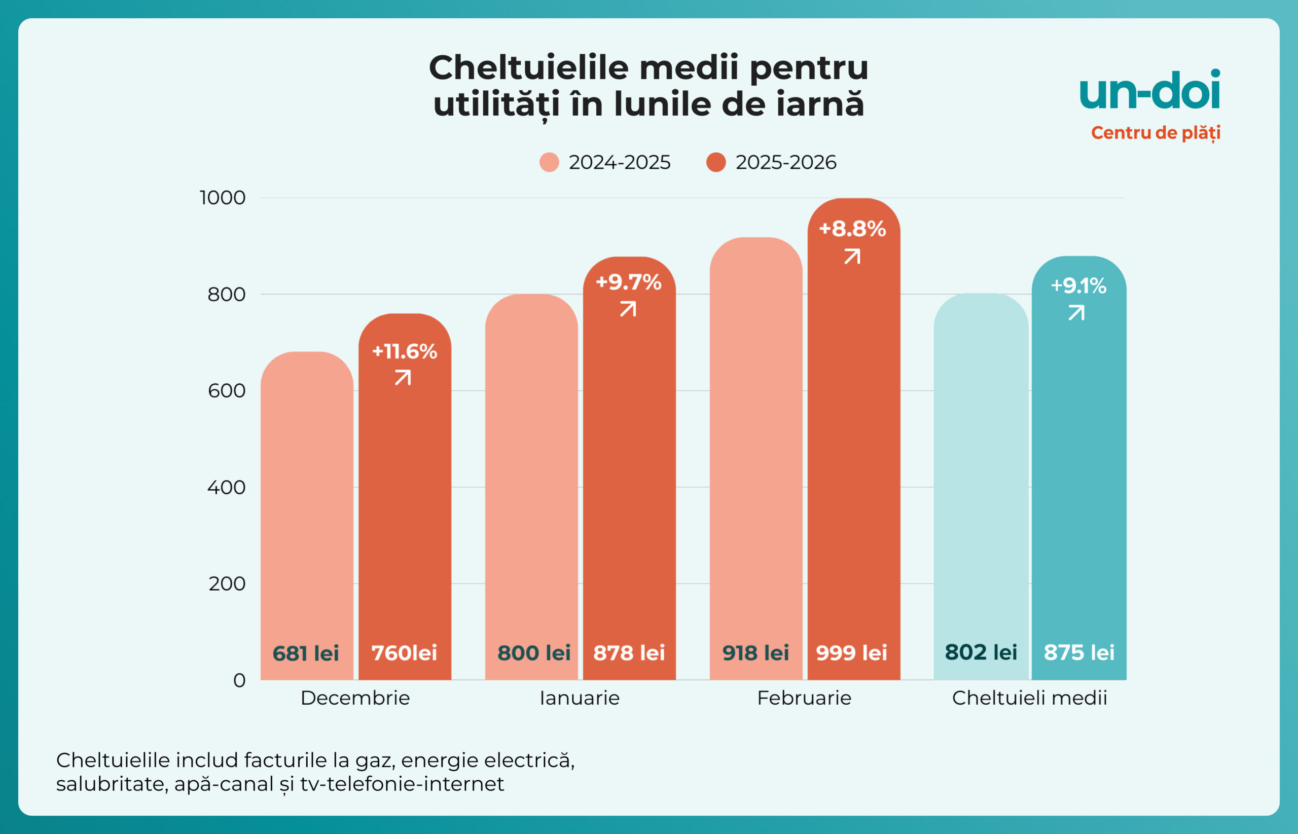 Iarna 2025–2026 a adus noi majorări ale costurilor la utilități pentru gospodăriile din România. Conform datelor analizate din peste 7 milioane de facturi procesate prin Un-Doi, valoarea medie a cheltuielilor lunare din sezonul rece a crescut de la 802 lei în iarna 2024–2025 la 875 lei în iarna 2025–2026, ceea ce înseamnă o creștere de 9,1%.