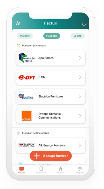 1.Deschide aplicația un-doi Centru de plăți și selectează butonul ”Adaugă furnizor” din secțiunea Facturi, tab-ul Furnizori