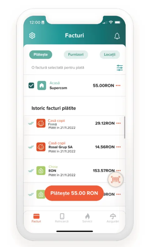 După adăugarea furnizorului, vei primi automat în aplicație valoarea de plată, lună de lună. Astfel, poți plăti toate facturile în același loc, iar experiența de plată va deveni mult mai ușoară.
