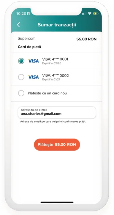 6.Selectează cardul de plată și apasă din nou ”Plătește”